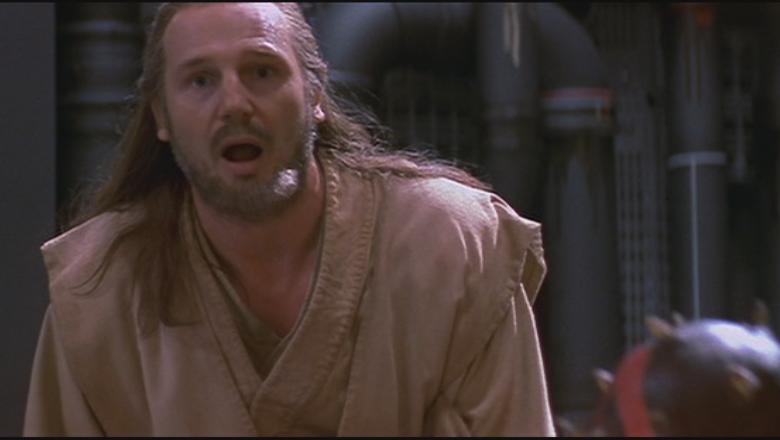 3:07 Obi-Wan Kenobi and Qui-Gon Jinn dehood in the Neimoidian conference room. I think Ewan McGregor and Liam Neeson make a pretty believable student-teacher pairing. Neeson in particular does a good job giving his character a lot of weight, which I think we need since this is our only chance to get to know him.