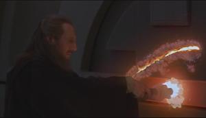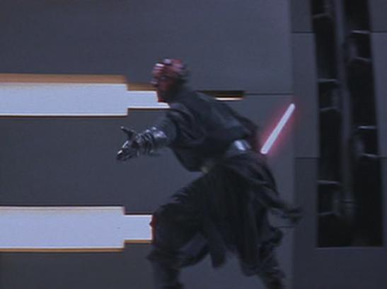 1:56:20 Obi Wan gets separated from Qui Gon and the battle moves into the gauntlet of red force fields, which serve no apparent purpose other than to interrupt lightsaber duels. Jedi super speed would be helpful here.