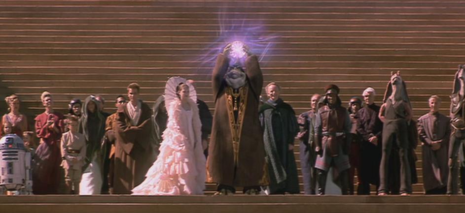 2:08:23 Naboobian Celebration, accompanied by a song I really like. Anakin finally gets a change of clothes. Amidala and Boss Nass share the Disco Ball of Peace. And they all lived happily ever after.