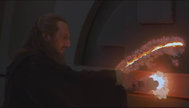 6:21 Qui-Gon melts the blast doors with his lightsaber. This is my favorite thing ever done with a lightsaber. Ever.