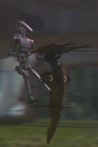 1:53:25 Jar Jar gets tangled up in battle droid wires and accidently uses it to take out encroaching enemies. I thought this was funny the first time I saw it and still maintain that the gag works pretty well. I also want to point out the hand-to-hand fighting in the background, which is neat.