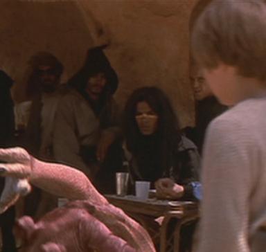 36:20 See the guy with the yellow stripe on his face behind Sebulba and Jar Jar? That’s Quinlan Vos, an undercover Jedi Knight on assignment in Mos Espa. I swear I’m not making that up.