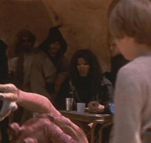 1:09:33 Anakin’s little Rodian buddy does a hip-shaking victory dance. The boy has got some moves.