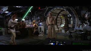 At least Kenobi passes down Anakin’s lightsaber to Luke – “Oh, that black smudge on the grip? Just dust it off. Bits of your father, you understand, from when I nabbed it off of his burning flesh.” Man, this movie gets WEIRD in light of the prequels. Even though Luke’s seen with the lightsaber on most of the Star Wars posters, him waving it carelessly about in this scene and fighting the training droid on the Falcon is about it for this movie.