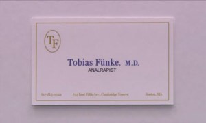 Tobias is gay — which is readily apparent to everyone except himself.  What makes this theme hilarious is that he’s a constant fount of unintentional innuendo, a stream of Freudian slips regarding the subject.  When he paints himself blue to be part of the Blue Man Group, he admits that “I just blue myself”.  Or when he references his old approach to being the first Analysis/Therapist, which culminates in the unfortunately-titled “Analrapist” cards.  That’s okay, because we love the guy, and even when he’s broke he’s willing to “stuff your sweet, pink mouth with so much ice cream that you’ll be the envy of every Judy and Jane on the block!”