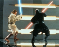 And then there’s lightsabers. TPM contains the best — and after watching all six episodes numerous times, I mean this — the BEST lightsaber battle ever. It was worth every broken finger suffered by cast and crew in the rehearsals to get the Maul-Kenobi fight on film. Okay, I know that the Kenobi-Skywalker slug fest in Revenge of the Sith was supposed to be a crown jewel of dueldom, and that the Yoda-Dooku spat in Attack of the Clones was cool in a Red Bull Marketing Division sort of way. But take away CGI and you’ve got no ninja Yoda. For that matter, take away the distraction of mood lighting and CGI lava and maybe the Kenobi-Skywalker fight looks a thousand percent better. But for sheer unadulterated and beautifully choreographed whoopass, give me those sword-sparking twenty seconds of The Phantom Menace any day of the week.