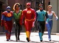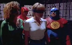 Drew: I can kind of see what they were going for — not the modern Justice League, but the 80s one, where they spent as much time playing pranks on each other as saving the world — but it just fails. Aside from the fact that the timing and humor that works in comics doesn’t translate well to TV (and vice versa), it’s pretty hard to recreate a successful comic by completely reinventing all of the characters. The Giffen Justice League was zany, but they still got the job done and had some dignity. In contrast, these guys’ personal lives are worse than Peter Parker’s, every one of them. And that’s just sad. The reason (non-animated) superhero shows rarely work is largely economical- in a comic, you can have a massive interstellar fleet destroying planets in every panel for 22 pages and all it will cost you is the artist’s salary. But TV requires special effects to depict the same thing, and that’s more than most shows can afford. So you can understand why they chose to adapt the more humorous, squabbling 80s League… but they didn’t capture any of the humor or magic of Giffen’s characters, so they might as well not have bothered.