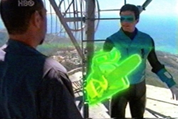 Justin: “Juicy Fruit”, actually, Drew. GL just shoots a ray into the sky and pulls himself up… oh, it’s a helicopter.