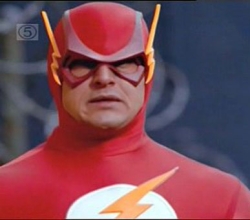 Drew: Whoa, the Flash needs to cut down on the donuts. Spandex: not flattering for your more, uh, robust heroes.