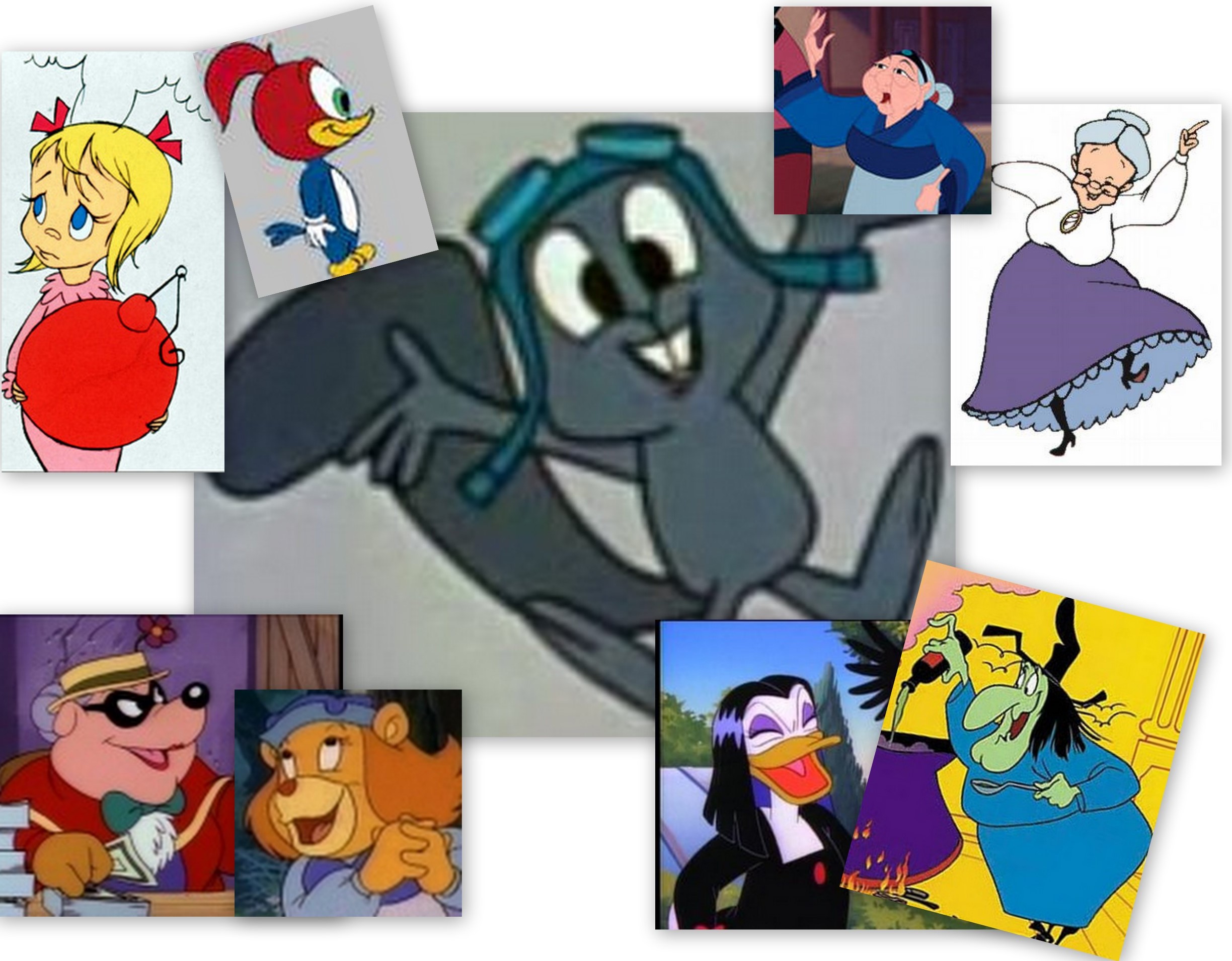 Center: Rocky Squirrel; Clockwise from Top left: Cindy Lou Who, Knothead, Grandma Fa, Granny, Witch Hazel, Magica De Spell, Grammi Gummi, Ma Beagle