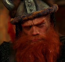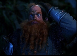 That’s the cue for us to meet yet another companion, Elwood the Dwarf. He’s not so much Dwarfy, considering that he’s just as tall as most of the other characters, but he’s got the beard and the axe and the Viking helmet, so I’ll forgive the indiscretion. Elwood’s my favorite in this movie, as he quickly proves that he not only has a goodish sense of humor, but single-handedly takes on Blue Lips here and actually knocks him down! Go ‘woody!