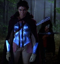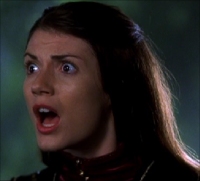 Back at the same wooded lot two scenes prior, Snails wants to sell the loot while Ridley is bound and determined to get himself a girlfriend. They’re captured by — no, not Blue Lips, he’s fighting the morning commute — shadowy figures with crossbows. Who turn out to be Norda and her crew. First of all, elves with CROSSBOWS? Is this the laziest bunch of elves in the world? And second… we finally see Norda’s full ensemble. Putting Joel Schumacher to shame, Norda’s breastplate is so generous and pointed with her breasts, that let’s just say we’re very surprised she’s not constantly tipping forward in this scene. She’s a material girl in a material world. Norda, playing a huge catch-up game to be the most unlikable person, snarls insults like “human!” and sneers all unfriendly-like. She wants to arrest Ridley and Marina, but Ridley explains the laughable plot up to that point. This gives Norda pause, because she really likes Star Trek and wants to be a Vulcan instead of an elf. So she whips out her pocket communicator and calls the Empress. You’d think I’m lying, but… no, sadly not. Pocket communicator and all. Her image appears in the Empress’ magictm mirror, and the Empress asks for a situation report from the planet surface. Thora Birch in this scene looks about seven years old, and acts pretty much the same. You know what? I’m starting to think that Profion is actually in the right in trying to remove this clueless snot from power — she has no business being a hall monitor, nevermind an Empress of a largely CGI kingdom. She tells Norda to find Blue Lips before her bedtime, and also to bring her a warm glass of milk. 48:21