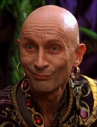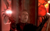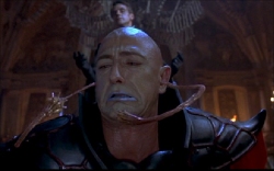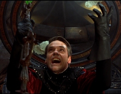 We get our first glimpse of Profion (Jeremy Irons), freshly back from another circuit through pharmacy conventions. What’s Evil wearing today? Black garb, a maroon cloak, and a crazed expression, it seems. While he makes his descent down the Evil Beauty Pageant staircase, his first runner-up Damodar (Bruce Payne) is standing by. In a movie full of wacky outfits, prosthetics and hair design, Damodar handily tops them all due to a little thing we like to call Blue Lips. Seriously. His lips are bright, Kool-Aid blue. And he’s completely bald. The whole effect of his look screams less “threatening” and much more “got lost on my way to a rave.” 1:56