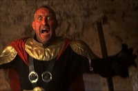 In the film’s first key action sequence, and one of the very few ones that have anything remotely to do with the Dungeons & Dragons role playing game, Ridley enters his “dungeon” maze. Jabba’s entourage watches from above. The first hallway features both spikes shooting up and huge pendulum blades swinging at precise moments. Every person who’s played a video game in their life shrugs, releasing all tension, as they realize that all Ridley has to do is jump-pause-jump-jump-pause-run. Piece of cake. Ridley accomplishes this fairly mundane task while the musical score has an epileptic fit. The next room hosts dozens of stone eyes that shoot gigantic fireballs. As Ridley crouches, afraid of losing his precious locks to heat damage, it’s apparent that he’s carrying the priceless, highly flammable scroll. *beating my head on my desk* Listen up, Ridley, for all of your crinkles and shoddy acting, you’re not the most annoying character here, so don’t push your luck. My hatred can only be spread around so far. He figures out this simple trap and leaps through a closing doorway, which knocks his fedora off of his head. The third room, which has both spikes AND fireballs, is also easily defeated by a sword strike to an hourglass. This admits Ridley into the final chamber (short maze, eh?), where the Eye is on a sinister pedestal. Red light bathes the chamber, as Ridley carefully advances, checks for traps, and… well, just takes it off. That’s it. No big finish. The Deadly Maze Of Three Rooms And No End Boss, folks! 41:10