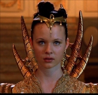 Hooboy, after that scene, what could top the exciting rise in action? Why, it’s a counsel scene — with laws, fillibusters, and passionate discussion of politics! Because that didn’t tank The Phantom Menace or anything. A loud angry guy is speaking: “The counsel has voted, you must oblige us!” Hey, are they going to make the Empress belly dance for them? I could use that soothing comfort after the harsh agony of Snails’ death. The Child Princess is now decked out in a poorly-aligned crown and huge fin-spikes coming out the back of her. I think it’s a natural response to feeling threatened or aroused by the belly dancing command. She’s defying the counsel, because she just can’t “defy her own conscience.” Bravo, young lass. Words cannot honestly describe how badly Thora Birch gives this speech, but the closest you can imagine it is if you were seeing a first time performer at a high school play give a recitation with absolutely no coaching beforehand. Wooden, dull, and highly laughable. Where’s Blue Lips when we need another character murdered? Profion comes in,