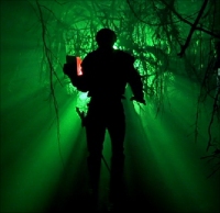 Because D&D is an equal opportunity plagiarist, we now have the elves giving gifts to Ridley. Namely, a big honking sword that Ridley should not be able to use, being a thief and all, but it’ll look good over his mantle at home. The elves talk in gibbleygook that Ridley has “true potential”, possibly to end this movie and let us all leave. The heroes embark on a journey of approximately three steps until they get to a “dungeon” that looks as if it’s filmed at a local park. Ridley goes in the cave, but the other three are banned by a force field that wisely knows they’ve proved of no use so far, so why start now? Elwood, peeved that he’s been given nothing to do for the past ten scenes, gets himself knocked down again by the force field for good measure. Ridley stalks through a green-lit, root-filled cavern that in no why infringes upon Dagobah copyrights. It is beautifully shot, to give the filmmaker this tiny bit of credit. Ridley falls through a hole (such a nimble thief) and discovers an intricate dragon door. Hey, out of curiosity, how’d they get these huge doors made
