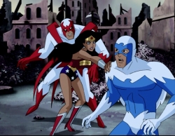 21:00: The Brownshirts put down their weapons, and the robot shuts down before it gets a chance to squish Dove. Wonder Woman reluctantly releases Hawk.