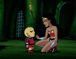 11:59: It’s not the Rancor. It’s a chibi Etrigan. Absolutely hilarious. In contrast to the others, he appears to be a toddler. He manages to beat down MiniSupes – lot of that going around – and climb out of the energy playpen Green Lantern makes for him, only to be foiled by MiniWonderWoman speaking in a firm voice. “Bad, bad Etrigan!” She holds the baby demon and burps him.