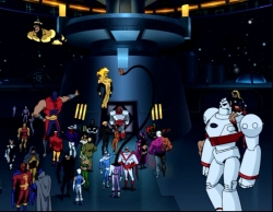 0:2:30: GA is welcomed by Superman, Batman and Wonder-Woman, with backup dancers Jonn and the Flash looking on with folded arms. The opening strains of the horn-heavy theme song play as GA belatedly demands to know where he is. “Among friends!” says Superman in a youthful tenor voice totally unlike any other one I’ve heard in a Superman cartoon. Seriously, guys, bring back the sixties Father Beaver voice. Green Arrow turns with shock and horror to see that the entire big room behind him is full of poorly-animated superheroes, including a giant robot with a girl riding on his shoulder who must have wandered over from the manga next door. (I really think the only reason giants ever make it into ensemble casts is to make better background shots.)