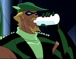 08:01: Heh. “Roger that.” Yet I’m still sympathizing more with Captain Atom than Super Twit. The writers feel it’s important to waste several seconds of screen time showing us Green Arrow lounging in the door to the plane, drinking something transparent from a bottle with no label. He must’ve found Green Lantern’s Absolut stash in