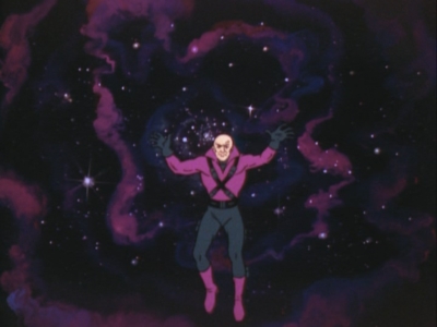 The credits begin with Lex Luthor coming at us from what appears to be either a disco or a funky nebula: