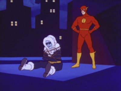 Solomon Grundy throws a rock which Superman punches in half (c’mon, Supes, he just wanted to play catch!).  Following this, the Flash runs — xylophone tinkling in full excitement like we’re watching the Flintstones or Scooby Doo — and ties up Captain Cold with six feet of twine: