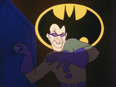 We then are treated to goosebump-raising examples of the Superfriends foiling the Legion of Doom.  Batman, for instance, shines the Batsignal on the Riddler, who is conveniently standing by the open window at a bank vault: