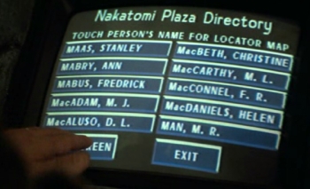 “Nice toy,” McClane smirks as he uses the Nakatomi Towers’ touch screen directory to locate his wife.  It’s a little pointless that the guard makes him do it — after all, there’s only one party in the building as he says a few seconds later — other than to establish that John’s wife is back to using her maiden name.  Still, like most 80’s movie technology, it’s shown with such a “gee WHIZ!” excitement about how cool it is (dude, it responds to your TOUCH) that I can’t help but find it charming.  Especially now that I lug around a phone that’s fully operated via touch screen.