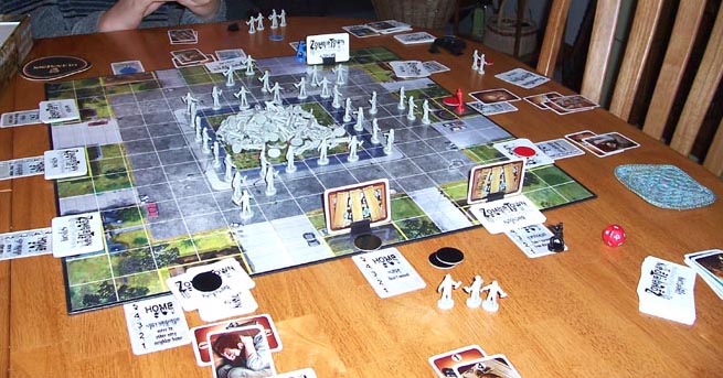 The game takes place in a pleasant little suburb with the misfortune of having a really big cemetery smack in the center of town. Each turn, the undead creep out of the graveyard (there are 100 in all) and slowly begin advancing towards your neighborhood. Each player has ten turns to locate survivors, weapons, and as many supplies as possible before the streets are completely overrun and the game ends.