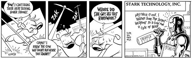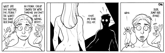 Here’s an exercise for you: take popular comic strip Bloom County, chuck all the political and social commentary, give it better artwork, and tack on a love story. Do all that and you’ve got Liberty Meadows, a strip about humans and animals coexisting in the titular animal sanctuary. Created by writer/artist Frank Cho for newspapers, it ran for 4 years before Cho made the unprecedented decision to switch it over to comic books. Loyal readers have continued to follow the strip, which alternates between three general plotlines: veterinarian Frank’s unspoken love for animal psychiatrist Brandy (and repeated failures to ask her out); the comic misadventures of the animals, notably midget circus bear Ralph’s inventions and chauvinist pig Dean hitting on anything with a pulse; and the funny but sweet friendship between Truman (a duckling) and Oscar (a dachshund).