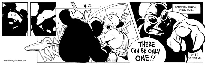 There are two main reasons to read Liberty Meadows, and one is the amazing art. The winner of numerous awards, Cho possesses a grasp of anatomy (human, simian, dinosaurid) that eclipses most biologists; it’s impossible to read one of his strips without marveling at the fluidity with which the characters seem to move across the page. He has a (deserved) reputation for making his female characters absolutely stunning, but unlike most comic artists, Cho’s women are gorgeous but vaguely believable. That is to say, their breasts are large but don’t defy gravity, their waists are slender but realistic, and when they inevitably slug Dean, he looks like he’s getting punched. And the other reason is that Cho is one of us, a pop culture-obsessed nerd. The number of unlicensed guest appearances numbers in the dozens, including such diverse characters as Dilbert, Binkley, the Little Mermaid, the cast of Star Wars, etc. And frankly, I like a guy who appreciates the simple beauty of giant apes fighting Tyrannosaurs.