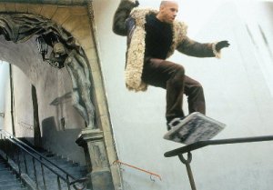 Justin’s review: I’ve seen or read numerous Vin “Bald Is Beautiful” Diesel interviews where he promotes XXX as being some sort of “new” spy movie, a James Bond-buster, an action thriller for OUR generation. Well, not MY generation, and probably not yours. I’m sure there are lots of kids (including the 30-year old variety) who consider themselves arnarchistic extreme sports junkies, but that’s only because of the Mountain Dew buzz they get while playing Dance Dance Revolution in the arcade.