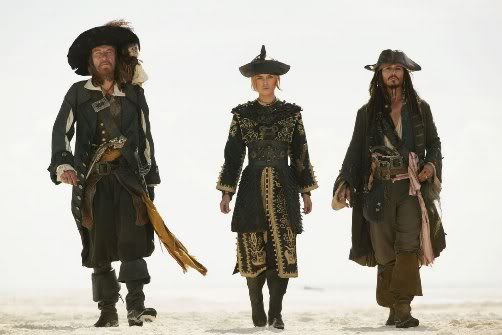 The funny thing about how much I like this movie is that I didn’t know it walking out of the theater. I mean, I enjoyed it, certainly moreso than the last one but not necessarily as much as the first. I knew I liked the music. I knew I liked the distinctly un-Disneyish resolution. On the whole, I knew I gave it a thumbs up, but didn’t really think it was something I felt strongly enough about to put pen to paper and sketch out a review for. Surprisingly, though, Pirates of the Caribbean: At World’s End has stayed with me, niggling in my brain for the last couple of days and refusing to go away. The soundtrack has gone into regular rotation on my iPod and every time the movie has come up in conversation, my comments have grown more and more positive. Finally, I think it’s reached the point where I can declare my manly, piratey love for everything At World’s End has to offer. So come on! Be a rascal, a scoundrel, a villain, knave! Join us devils and black sheep, us really bad eggs! Drink up, me hearties! Yo ho!