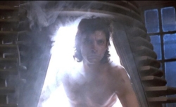 Jeff Goldblum is, well, the same guy he plays in pretty much every film he’s been in: wide-eyed expression, stuttering out a halting monotone, conveying “urgent” without ever raising his voice. It suffices. He’s also one of those rogue scientists who rents out warehouses in order to conduct experiments that cover the sort of terrain where angels fear to tread. In this case, teleportation via enlarged salt-and-pepper shakers. After casually turning a baboon inside-out (where do scientists keep getting these test baboons from? Comic book ads?), he finally figures out the secret to transporting “the flesh”. Memorize those two words, because this screenplay rehashes that phrase so many times despite the fact that nobody actually says “the flesh” in conversation unless it’s followed up by “that I want to cut from your body and make into a skinsuit to impress my serial killer pals.”