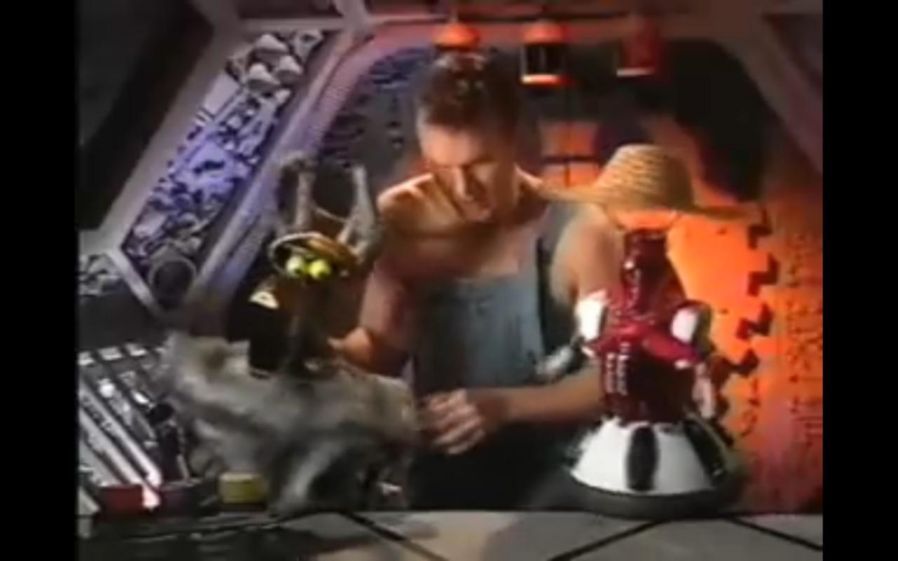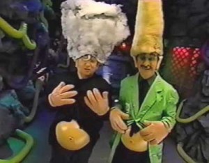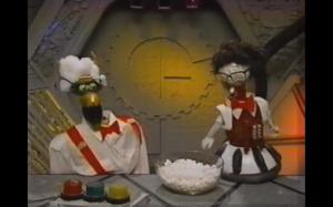 This daft bit hails from the underdog episode 612, Starfighters-a movie about abso-freaking-lutely nothing but jets refueling. It’s a testament to the genius of the show’s writers that they were able to make anything remotely watchable out of this. No worries…the not-so-brave need not sit through this one to enjoy the hilarious BBQ-sauce skit. As with the Holo Clowns act, we’re thrown right into a snake pit of crazy when Dr. Forrester opens the episode trying to introduce Mike and the bots to his newest invention which consists of some wires strung from his head to Frank’s.  He barely gets started when Mike breaks in with a growling dare to take on some of Mike’s ricochet barbeque sauce. Mike’s down-turned Elvis mouth, the (literal) ten gallon hats he and the bots are wearing, the hats getting “shot” off every time they scream “Rick-O-SHAAAAYYYY”, and Crow’s hilarious screeching of the word “BOOOOOLLLD!” all make this one of my favorite skits.