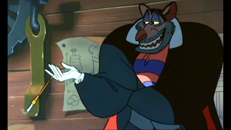 What happens: As the captive Flaversham works glumly away in his cell/workshop, a puff of cigarette smoke wafts toward him from behind. He turns. There stands Professor Ratigan, cigarette holder between his fingers, standing in the shadows and chuckling.
