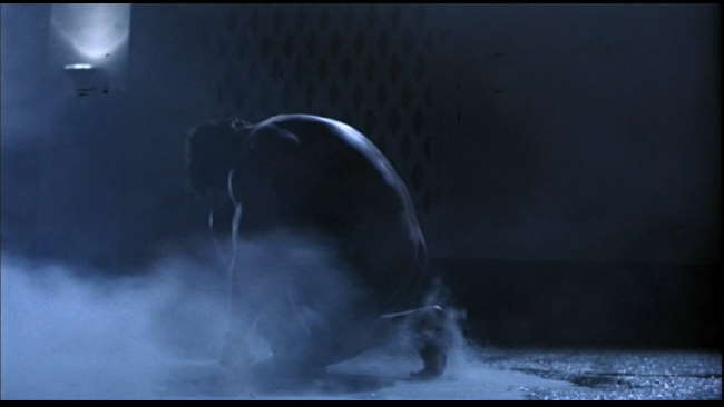 Why it’s cool: Well, first off, Jack Nicholson is awesome, so he totally nails this scene with his performance. Second, the entering-from-the-shadows bit is masterfully pulled off – we all know what the Joker’s supposed to look like, but when he’s semi-obscured like that, it blurs the details just enough to make things creepy. He looks wrong somehow, but you can’t quite make it… oh, crap! (And, of course, this comes just after the classic smashing-the-mirror sequence, which prepares us for the worst.)