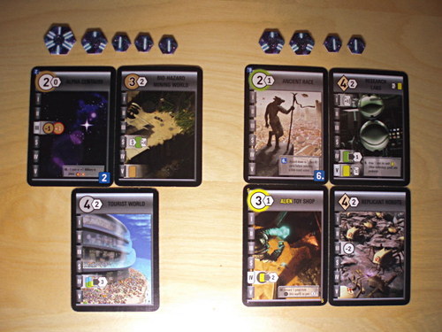 Expanding your empire requires planning and strategy, whether you choose to colonize peaceful planets and harvest their resources, bulk up your military and take planets by force (and some can *only* be taken by force), or develop a highly regulated engine of advanced technologies that will maximize the output of every card you play.  They are all legitimate paths to victory and the wealth of different cards you draw ensure that each game is full of tough choices and temptations.
