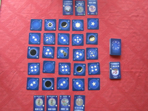 One further note—the game box for The Stars Are Right says this game is designed for 2-4 players.  I’m firmly convinced this is a misprint.  I can’t imagine playing this game with more than two people: adding a third pair of hands into the pushing, pulling, and flipping is like riding a unicycle down a tightrope and deciding to juggle power tools along the way.  I’m sure it could be done, but you’re probably not walking away without an injury.