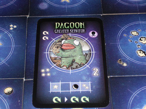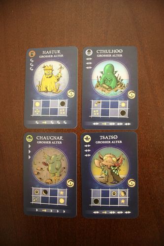 Each player has a hand of cards that grant different powers and, instead of a typical game board, you will be manipulating a 5×5 grid of double sided tiles, each showing a different configuration of suns, moons, stars, and comets.  Players will play cards from their hand to push, pull, and flip these tiles (sort of like a sliding number puzzle) until the stars are aligned correctly and they can summon minions and servitors who have special abilities and can assist in your ultimate goal of bringing forth Cthulhu and the other big bads who spell trouble for the rest of humanity.