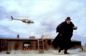 If you haven’t guessed already, Raimi did not aim for a cartoonish Batman & Robin-style superhero tale. This movie is extremely dark (hence part of the name), violent, and even the good guys aren’t all that good. Back to our torched hero, Darkman recovers with a disfigured face and severed nerve endings. His sensory depravation lends him super strength (somehow), and his scientific genus utilizes “liquid skin” to allow him to take on the face of anyone he photographs. Also, he’s got a trenchcoat. So now he’s got a toolset to take down any criminal organization.