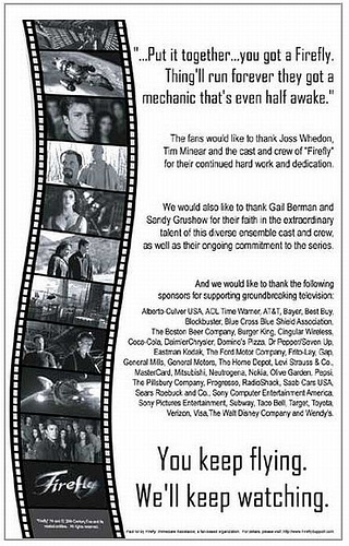 Let me get this out right now: I love Firefly. Really. I actually saw it in broadcast, I relished the DVDs, and I was there on opening night for Serenity. Firefly is a rare example of excellent scifi storytelling on TV, and one of the best shows of the past decade.