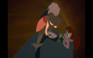 “My Name Is Batty” was a song written by white people, ok’d by white people, and performed by white people’s favorite white comedian. The whole thing is erratic (potatoes in a jacket), rushed and creepy. At one point Batty hugs a fairy tight, gives her a pervert stare, and gets a lechy tone in his voice. So Fern Gully has: Batty’s bad-touch eyes; Tone Loc singing as a lizard that flaps its tongue about and wraps it around people; and Tim Curry’s sexually ambiguous, confusing moaning and huffing as Hexxus. There wasn’t a song in this movie that didn’t make my nine-year-old self feel icky.