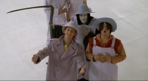 Boorish as our two lead characters are, the film does pick up when they team up with the Grim Reaper himself. Bill and Ted challenge Death in order to escape from Hell, and a classic sequence ensues as they play Battleship, Clue, electronic football, and Twister. Death is wonderfully exasperated in having to deal with the morons, and he ranks as a Grim Reaper right up there with the one in Monty Python’s Meaning of Life. By the way, can anyone tell me what kind of accent, exactly, that Death sports? German? British? Vulcan?