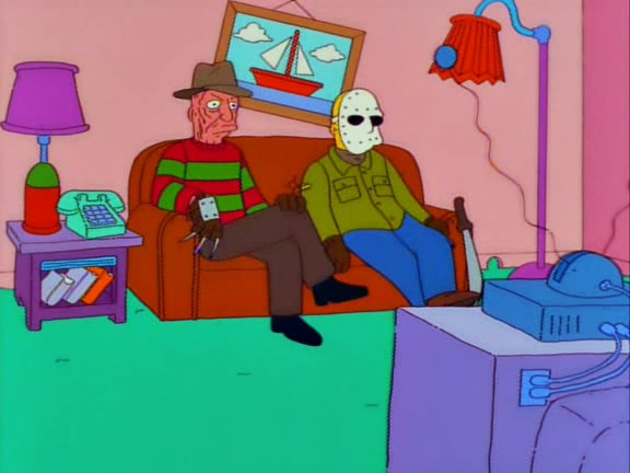 This isn’t the first time Freddy and Jason teamed up to victimize poor saps; during The Simpsons’ Treehouse of Horror IX, F and J are seen waiting for the family during the opening credits, unaware that the family has already been killed. Robert Englund did the voice for Freddy.