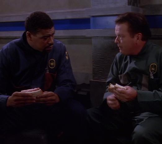 Man, this was just… poor. I understand the intent of the writer and I can see how the episode is supposed to work, but Mack and Bo are probably the two least interesting people they could have chosen. Star Trek: TNG did a seventh-season episode called Lower Decks that was in this vein, focusing on a group of junior officers who only knew Picard and Riker and Worf as their bosses and never got to sit in at the big briefing tables. I like Lower Decks quite a bit. Why does it succeed when A View from the Gallery fails? Lower Decks works, I think, because we get characters who have actual skill sets—they’re engineers and tactical officers and scientists. They’re not in charge, but they’re involved. Mack and Bo are just handy with a wrench. They’re not Rosencrantz and Guildenstern in this story, they’re Statler and Waldorf. They sit at ringside with no real role to play and chatter back and forth like they escaped from the Satellite of Love. Their interactions with the cast are minimal and their contributions are nearly nonexistent.