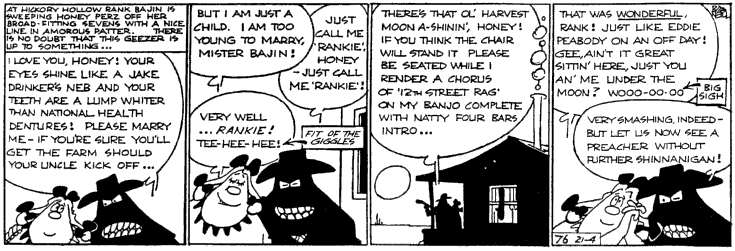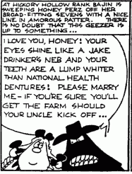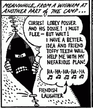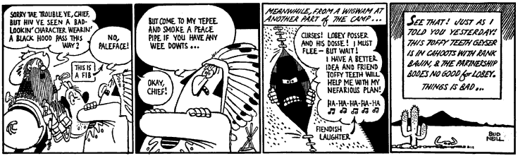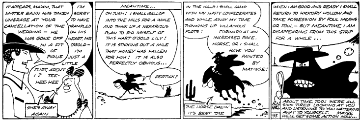 The vast majority of the storylines are focused on the battle of wills between Lobey and the constantly be-hooded Rank Bajin, who is quite literally the town’s resident villain – he even has an office with ‘Rank Bajin, Villain’ written on the door. I love Rank Bajin. How can you help but enjoy a character so devoted to being evil that on the rare occasion when someone else gets arrested for a crime in the strip, he takes it as a professional insult? (Not to mention that he’s got one heck of a command of the English language.)