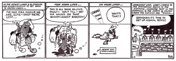 To start with, Calton Creek may be located in Wild-West Arizona, but for all intents and purposes it’s actually the furthest-afield suburb that Glasgow is ever likely to get – its residents speak in thick Scottish accents and pepper their sentences with regional slang (“Lobey’s the wee boy!”). And that’s the normal part – I mean, what do you expect from a Scottish strip? I’m guessing you don’t expect supporting characters like Rid Skwerr (“Red Square” in dialect), a miniature ghost who defected from the Russians (oh yes, there are anachronisms – are there ever), or Fairy Nuff, a… well, fairy who speaks in rhyme. Or, for that matter, the fact that the title character rides a two-legged horse – don’t see that every day, now do you?