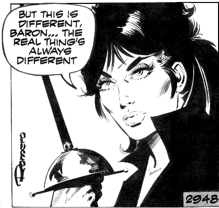 Moreover, while I don’t like to moralize when it comes to my adventure heroes, Modesty is different from Mr. Bond in a rather important way – she’s a good role model. Never mind the fact that she’s an ex-criminal, an occasional killer, and (at least in her older adventures) smokes like a chimney – the point is that she comes across as a real person, and moreover, an admirable one. Ol’ James is the king of cool, but speaking personally, I never really related to him. I mean, take away the suaveness and the quips and the pathological womanizing, and what do you really have? Modesty, on the other hand, seems like someone you might actually meet, if you traveled in her circles – we get to see her hanging out with her friends and enjoying herself, we get a good idea of her moral limits and just how far past them she’s willing to go, and we generally get an idea of just how gutsy this woman is. She is, in short, one of those rarest of things, a genuinely strong female role model, while remaining a beautiful woman who could kick your posterior – therefore appealing to both fangirls and fanboys. Willie Garvin makes for an interesting character, too – he’s a bit more traditionally Bond-ish, if Bond were a cockney bloke wot ‘appened to be best mates wiv a gorgeous gel. (Any actual cockneys reading this, please forgive me.) Basically, picture Bond as played by a young Michael Caine with martial arts and throwing knives instead of guns, and minus the love-‘em-and-leave-‘em mentality.