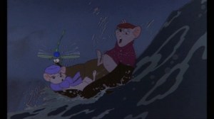 As for supporting characters, there’s a host of other animals to back our mousy heroes up, one of the more prominent of which is Orville, the irritable albatross pilot. He’s not actually in the film for very long – he basically just gets them to the swamp, then leaves – but he certainly leaves an impression, if for no other reason than the idea of mice using an albatross as an aircraft is both funny and visually spectacular. Plus, he’s voiced by Jim Jordan from Fibber McGee and Molly, so he’s got a good sense of comic timing – the scene where he encounters the Swampmobile is hilarious, and never fails to crack me up. More significant to the story is Evinrude the dragonfly, the Bayou’s local ferryman who gets B&B around the swamp in a leaf-boat using himself as the outboard motor. I really like Evinrude – even more than our two protagonists, he’s the “little guy” in the movie, frequently overextending himself to the point of exhaustion but always finding another wind. I was also rather impressed by just how well his character is delineated despite the fact that he has no lines – he’s basically “voiced” by gasps and wheezes and a varied assortment of buzzing noises. Among the other swamp critters, the one that stood out the most to me was Luke, the moonshine-swilling muskrat. This is partly because (Dumbo aside) you don’t generally expect such things in a Disney flick, but mainly because he’s voiced by Pat Buttram, who also played a prominent role in Robin Hood – hearing the Sheriff of Nottingham’s voice coming out of a good guy’s mouth is just kind of weird.